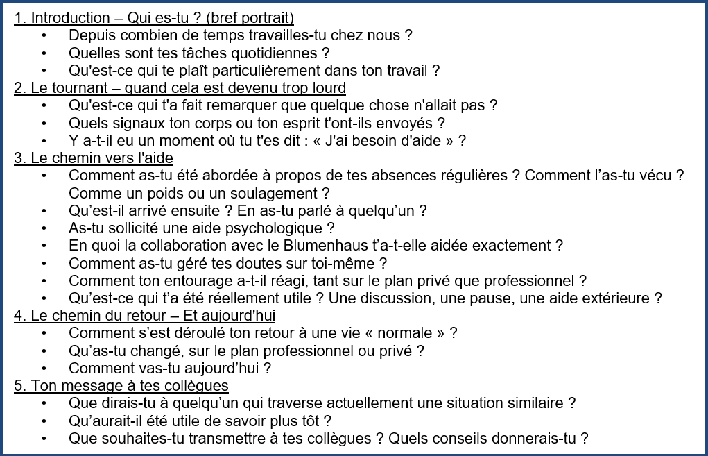 La collaboratrice, qui avait déjà fait preuve d’ouverture d’esprit lors de l’entretien, s’est déclarée prête à partager son histoire. À cette fin, l’équipe RH a élaboré des questions d’entretien et a mené un autre entretien avec la collaboratrice. L’article de blog a été rédigé à partir de ses récits. Avant la publication, elle a de nouveau expressément approuvé le contenu. Les questions suivantes ont été utilisées pour l’entretien avec la collaboratrice :
