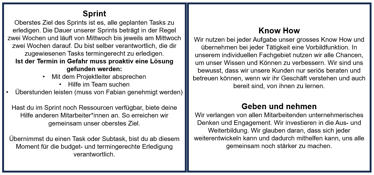 Le manuel explique par exemple comment les tâches sont structurées en cycles de travail de deux semaines (sprints) et comment les connaissances spécialisées et l’entraide contribuent à une collaboration fructueuse.