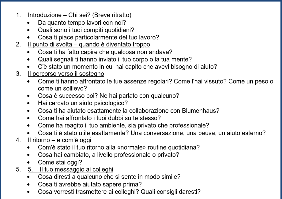La collaboratrice, che già durante il colloquio aveva dimostrato la sua disponibilità, si è dichiarata disposta a condividere la sua storia. A tal fine, il team delle risorse umane ha elaborato alcune domande per l’intervista e ha condotto un ulteriore colloquio con la collaboratrice. Il post sul blog è stato redatto sulla base dei suoi racconti. Prima della pubblicazione, lei ha nuovamente approvato espressamente il contenuto. Per l’intervista con la collaboratrice sono state poste le seguenti domande: