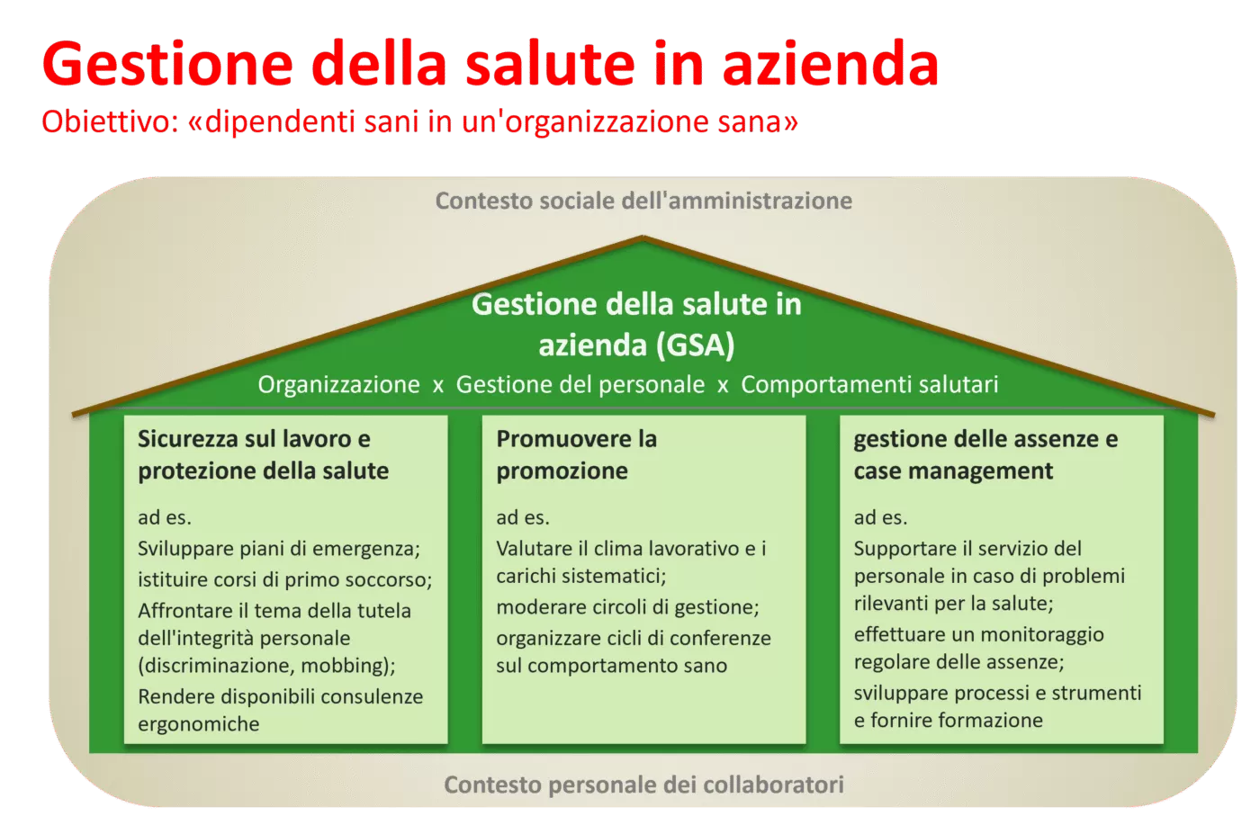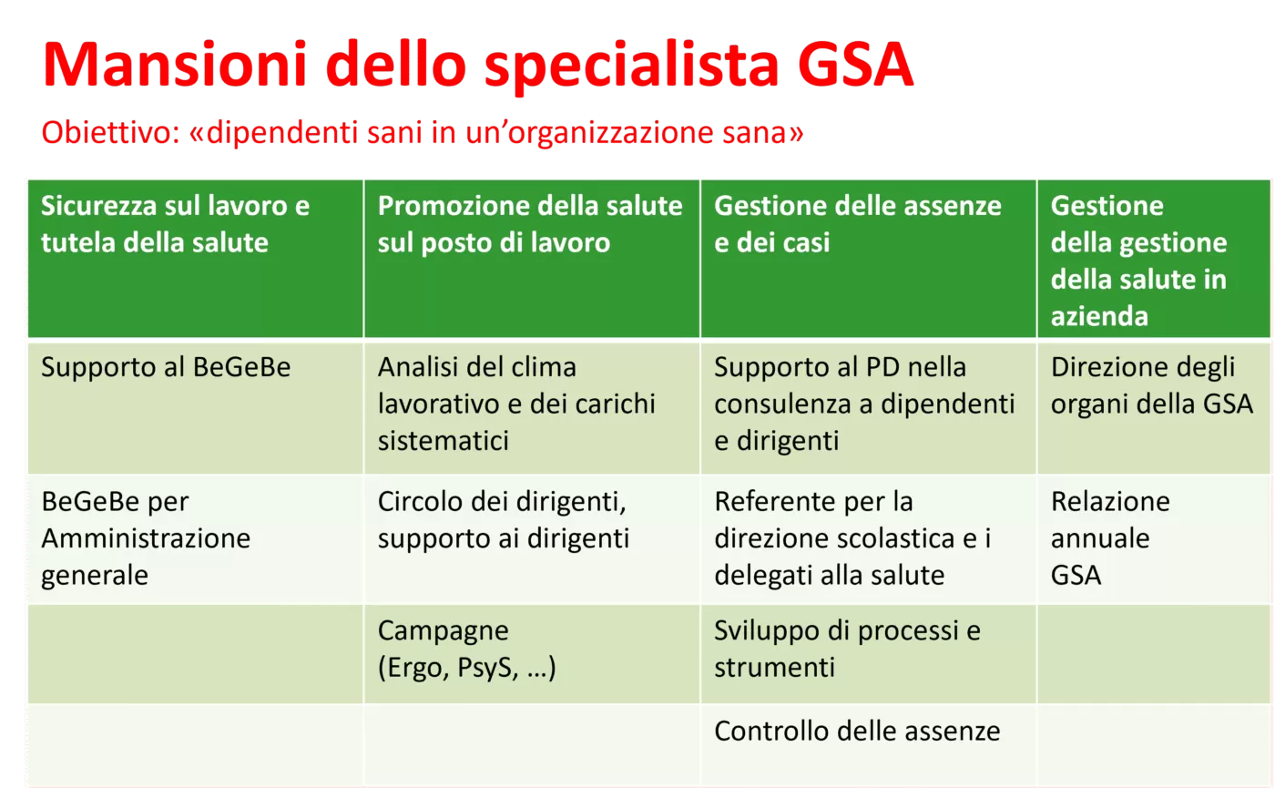 - Prospettiva della salute nello sviluppo organizzativo: in qualità di esperto, lo specialista in GSA apporta punti di vista preventivi e di promozione della salute negli sviluppi strategici.