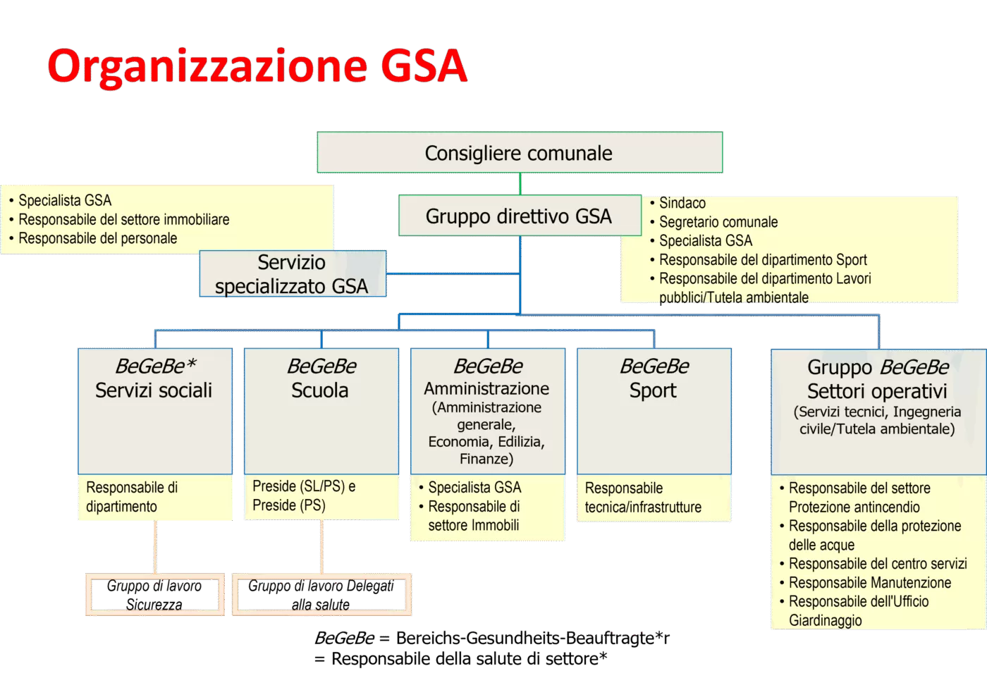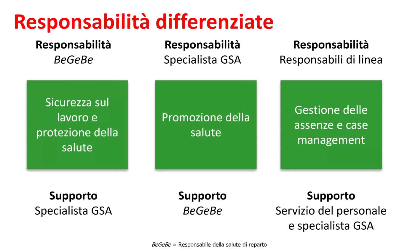 - Organi permanenti e servizio specializzato GSA: per lo sviluppo continuo sono previsti il gruppo direttivo GSA, il servizio specializzato interno GSA e la struttura con i responsabili della salute di settore (BeGeBe).