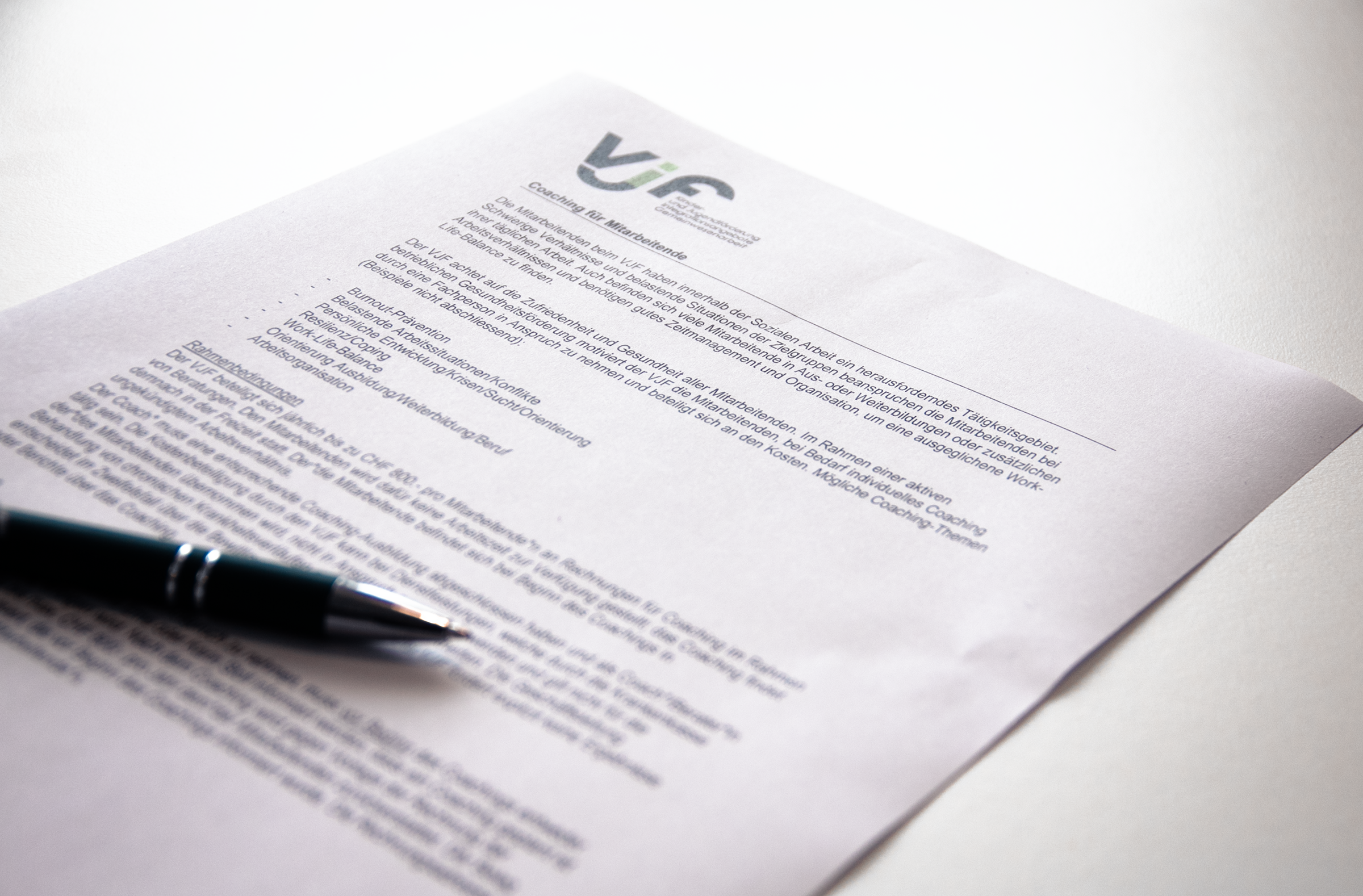 Daraus entstand die Idee, dass sich der VJF an den Kosten für ein individuelles Beratungsangebot (Coaching) für die Mitarbeitenden beteiligen könnte. Bis dahin hatten einige Mitarbeitende die Möglichkeit, ein Coaching zu besuchen, dies jedoch nur auf Vorschlag ihrer Vorgesetzten. Die Erfahrungen damit waren stets positiv. Um dem individuellen Unterstützungsbedarf Rechnung zu tragen, sollte dieses Angebot nun allen Mitarbeitenden niederschwellig zugänglich gemacht werden.