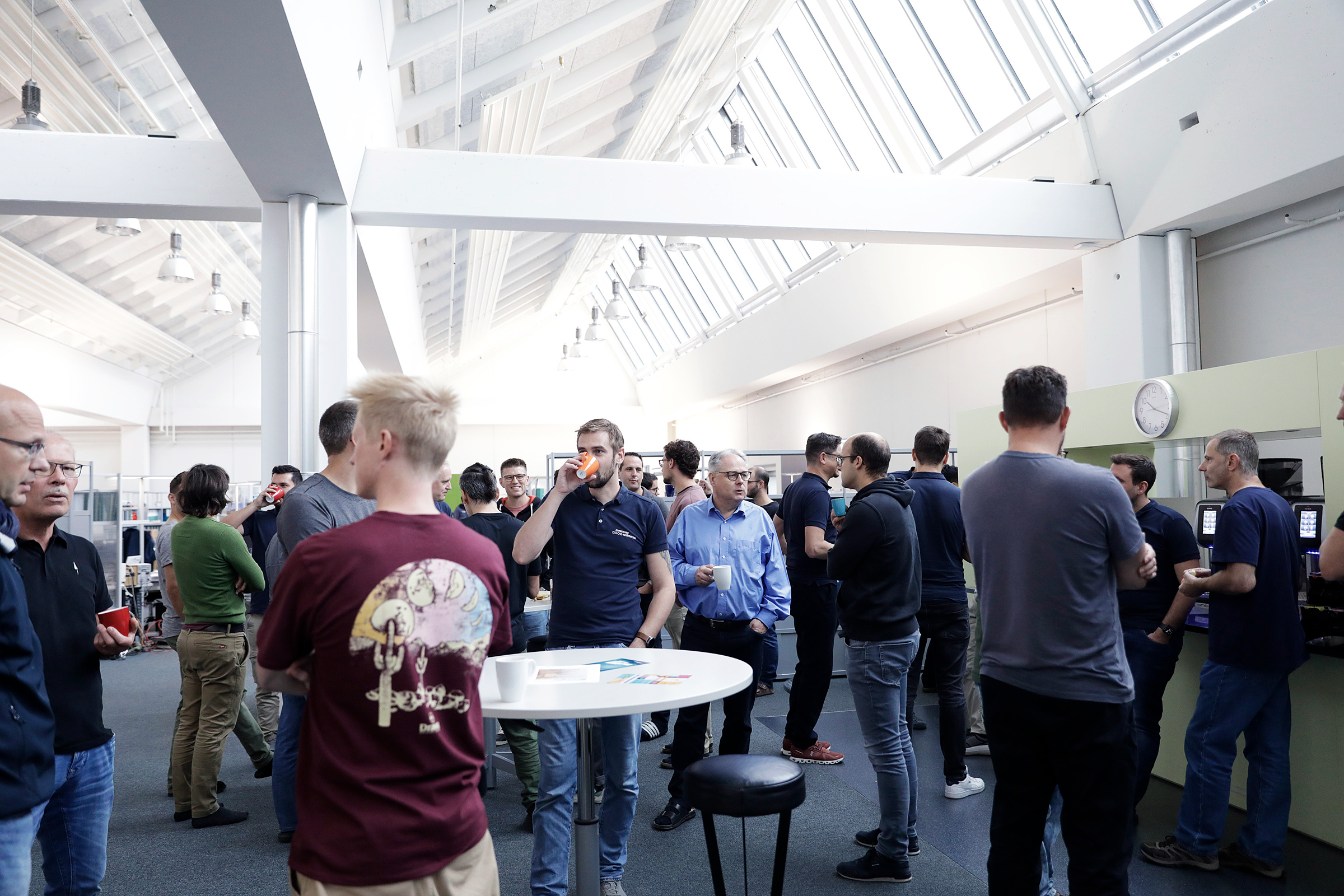 Die Mitarbeitenden arbeiten in zwei Grossraumbüros mit grosszügigen Platzverhältnissen und sind oft bei Kunden auf Inbetriebsetzung. Der Wissenstransfer findet persönlich statt, da wenig Schriftlichkeiten bestehen