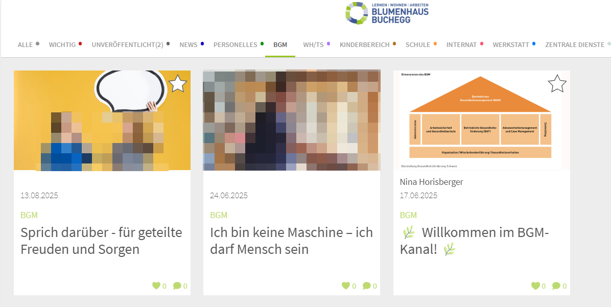 Auf der internen Website gibt es einen BGM-Kanal, der neu für die Kampagne geschaffen wurde. Auf dem Bild zu sehen sind die drei ersten Blogbeiträge. Rechts eine Einleitung und Ankündigung der Kampagne. In der Mitte den Blogbeitrag mit der persönlichen Geschichte und links einen weiteren Beitrag zum Thema offene Kommunikation.