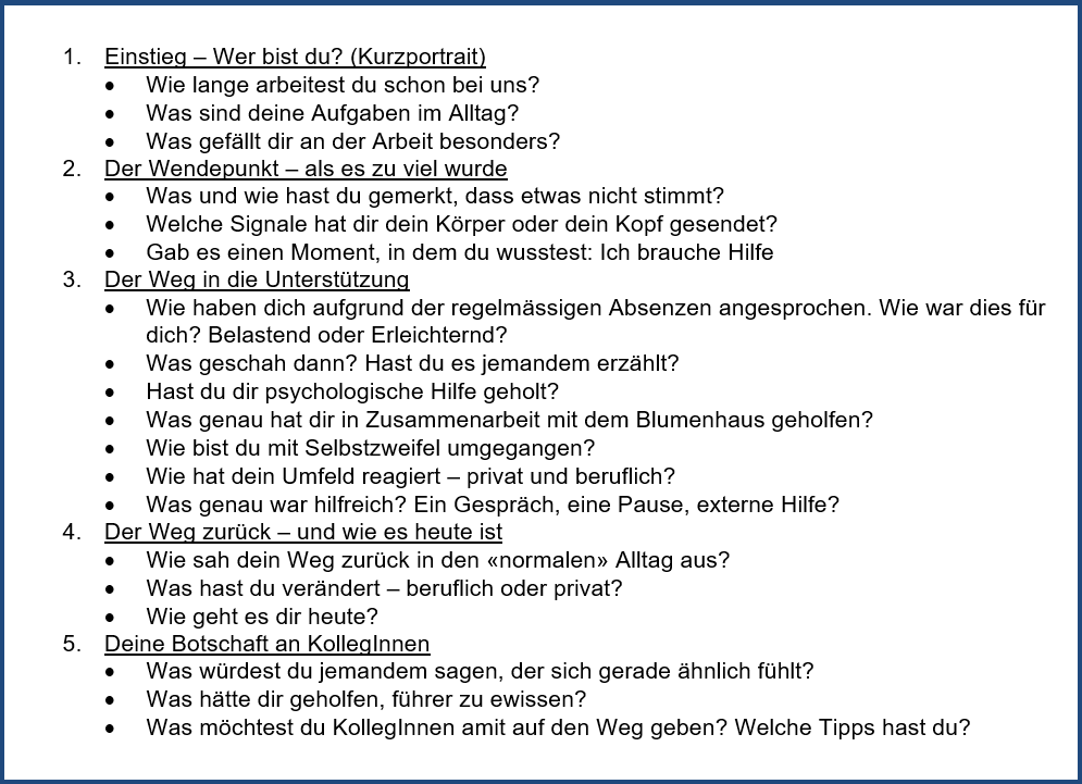 Das HR-Team des Blumenhauses stellte fest, dass vermehrt Mitarbeitende von Absenzen betroffen waren. Gründe dafür waren unter anderem Psychische Beschwerden und die Hürde im Unternehmen offen darüber zu sprechen. Daraufhin startete das HR-Team eine Kampagne, welche zur Enttabuisierung psychischer Belastungen innerhalb vom Unternehmen beitragen soll und so eine offenere Kommunikation und die Unterstützung betroffener Mitarbeitenden ermöglicht.