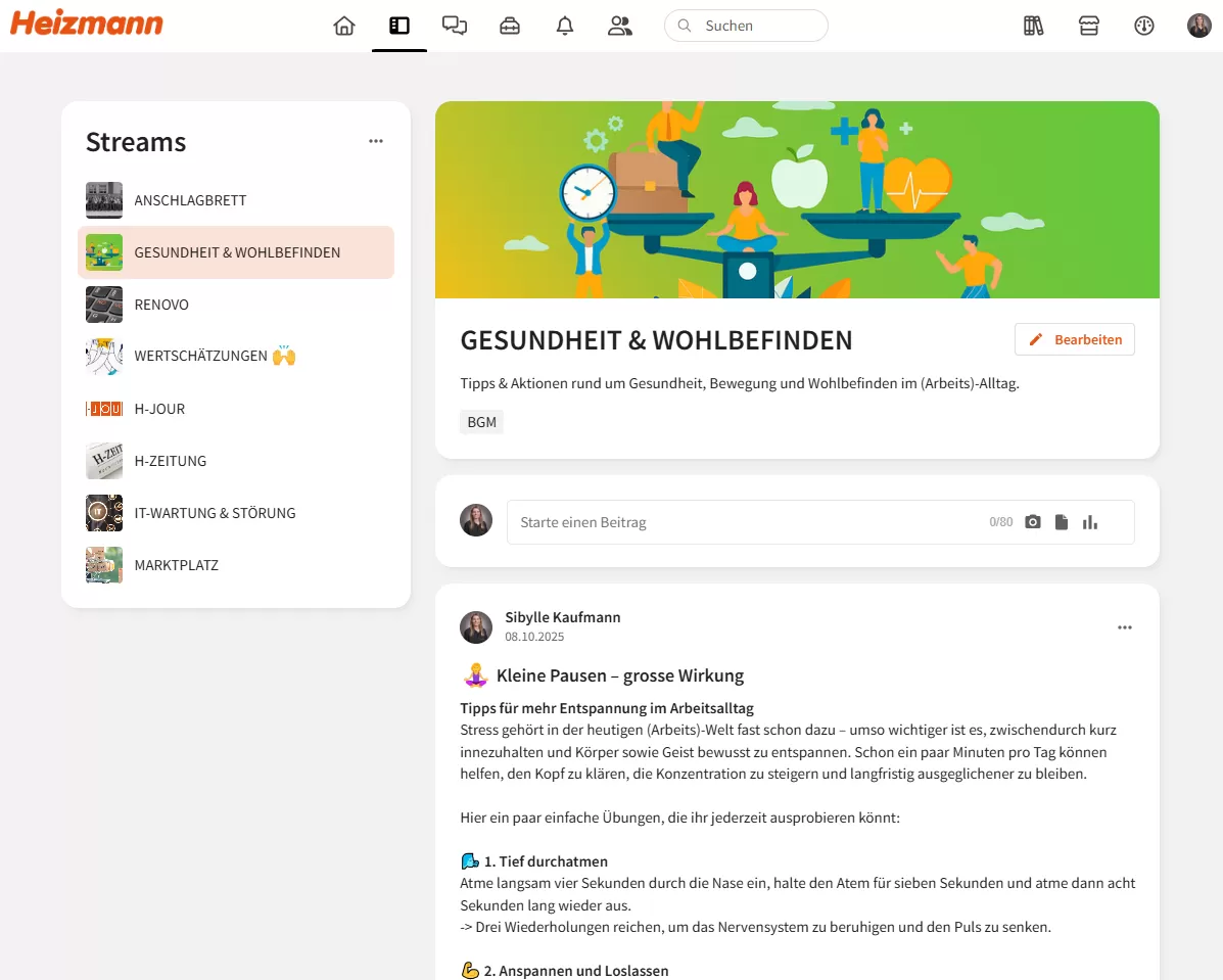 - Über die webbasierte App «Beekeeper» (s. Abbildung unten) erhalten Mitarbeitende regelmässige Impulse und Erinnerungen zu Atemübungen, Meditationen oder Dankbarkeitslisten.