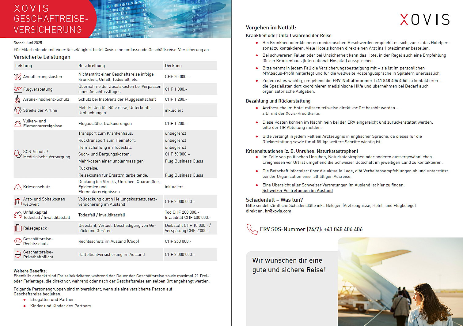 Ein Krankheitsfall während einer Geschäftsreise war der Auslöser für die Überprüfung der Sicherheitsmassnahmen bei Reisetätigkeiten. Ein Mitarbeiter bekam auf einer Auslandsreise plötzlich hohes Fieber – und wusste nicht, welche Unterstützungs- und Handlungsmöglichkeiten ihm zur Verfügung standen. Da rund 50 Xovis Mitarbeitende regelmässig für internationale Geschäftsreisen unterwegs sind, hat das HR-Team schnell reagiert. Für die Umsetzung konkreter Massnahmen wurde auch der CEO involviert. Das Vorgehen war wie folgt:
